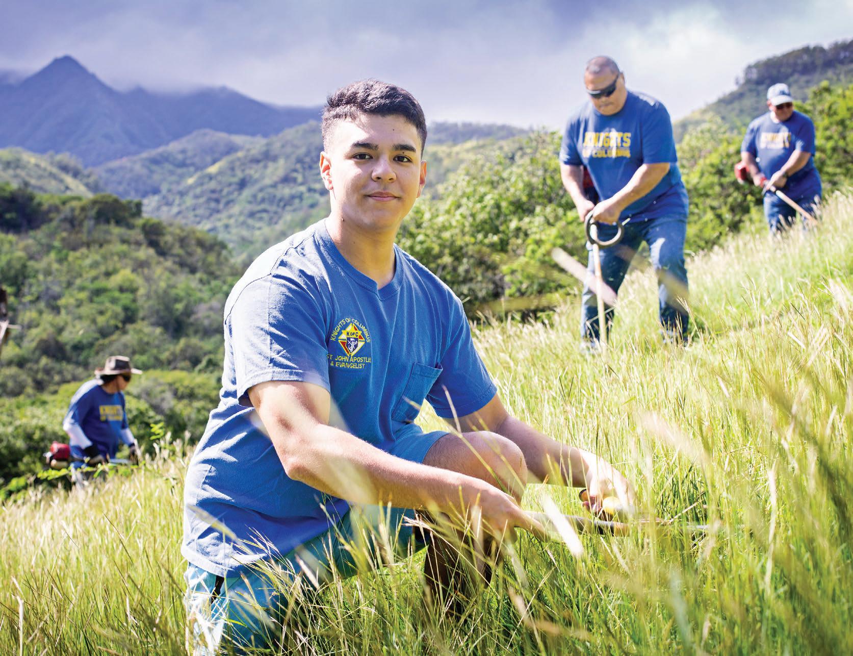 Los miembros del Consejo San Juan Apóstol y Evangelista 14663 en Mililani, Hawái, podan la hierba en una de las muchas colinas del Monasterio Benedictino de Hawái en Waialua. Los Caballeros llevan a cabo dos días de servicio al mes en el monasterio, ayudando en diversos proyectos a lo largo de los 67 acres de la comunidad.