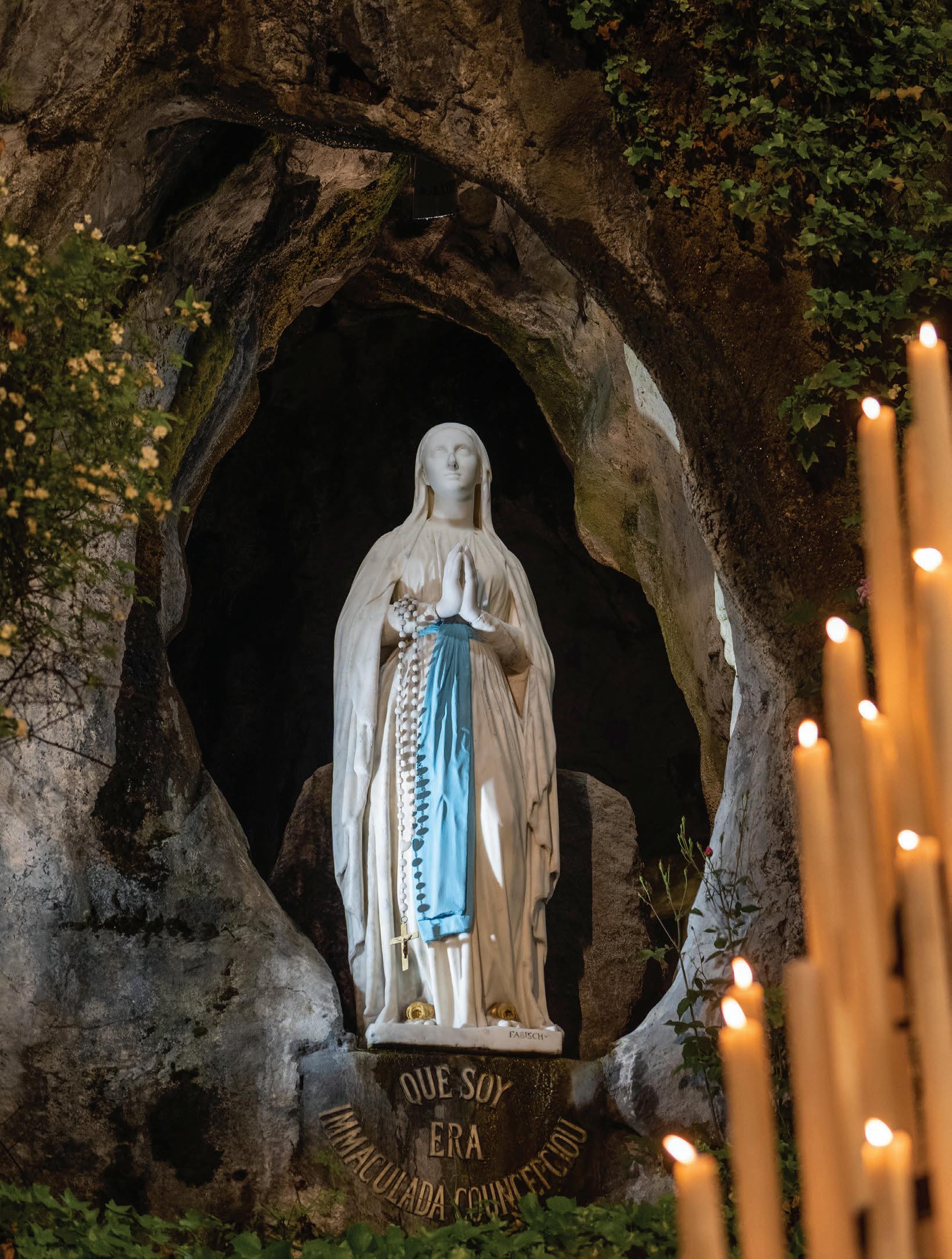 La estatua de María fuera de la Basílica del Rosario en Lourdes, Francia, contra el cielo del atardecer durante la peregrinación de Guerreros a Lourdes de 1023 (ver página 18). 15 18