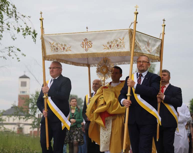 z rady tworzącej się przy Sanktuarium św. Jana Pawła II w Krakowie niosą baldachim podczas procesji Bożego Ciała. Uroczystościom w sanktuarium przewodniczył kard. Stanisław Dziwisz. „Rycerze