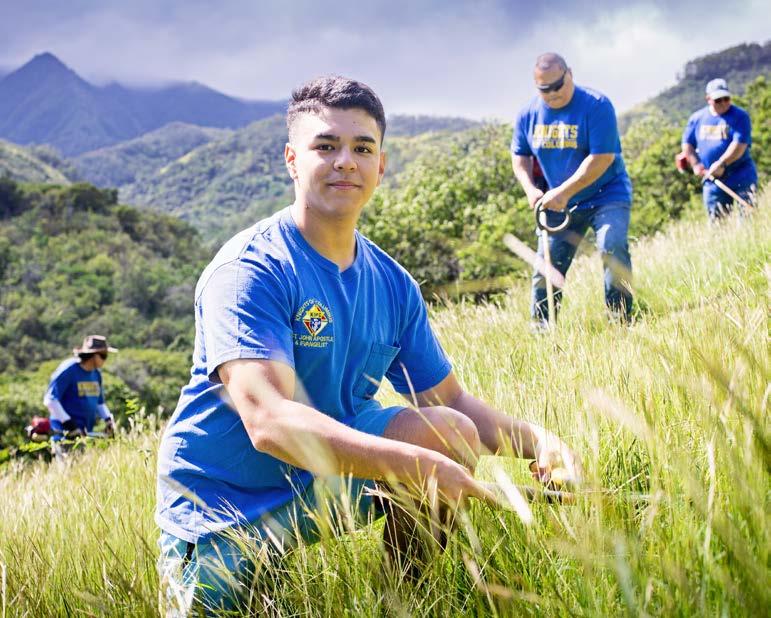 Rycerze z rady 14663 im. św. Jana, Apostoła i Ewangelisty w Mililani na Hawajach koszą trawę na licznych pagórkach otaczających Opactwo Benedyktyńskie w Waialua.