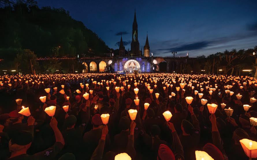 Des milliers de pèlerins provenant de plus de 40 nations participent à la procession mariale aux flambeaux pendant le 64e Pèlerinage militaire international au sanctuaire Notre-Dame de Lourdes en mai dernier (voir page 7).