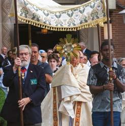 Rycerze Kolumba służą poprzez przygotowanie ołtarzy, niesienie baldachimów czy służbę porządkową na trasie procesji. Na zdjęciu
