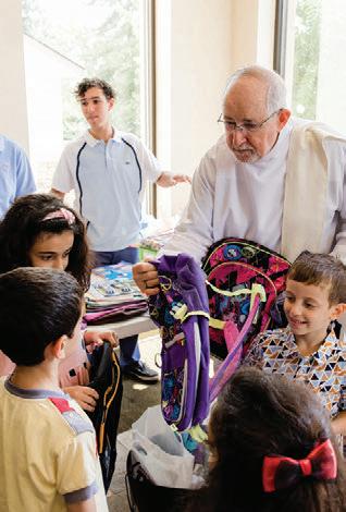 Deacon Bob Calabrese, a member of All Saints Council 11402 in Atlanta, distributes backpacks to children following Mass at St. Joseph Maronite Catholic Church in Sandy Springs, Ga. Knights at the parish collected backpacks, notebooks and other school supplies for Catholic Charities Atlanta to o er to children in need.