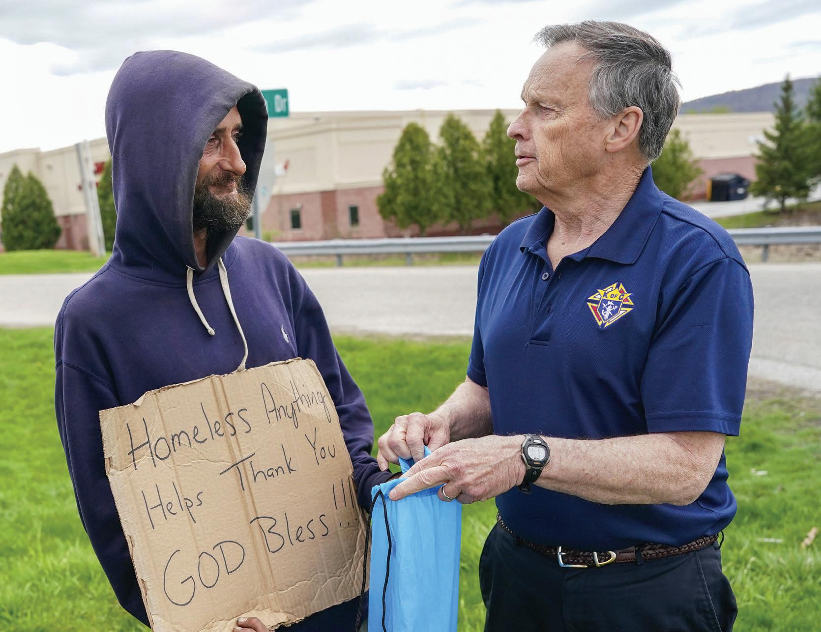 Michael Lannon, director familiar del Consejo 232 de Rutland (Vermont), le entrega una bolsa que contiene agua, refrigerios y artículos personales a Dan García, quien ha estado sin hogar durante los últimos años. Dos veces al año, el Consejo 232 prepara paquetes de ayuda para que los Caballeros los guarden en sus automóviles y los ofrezcan cada vez que se encuentren con alguien que se encuentra sin hogar. La tasa de personas sin hogar en Vermont ha aumentado significativamente desde 2020 y ahora es la segunda más alta entre los estados de Estados Unidos.