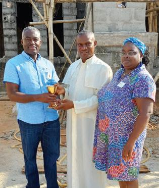 Samuel Onyewuchi (izquierda), miembro de la Asamblea Father Abram J. Ryan 1087 de Dallas, y su esposa, Reshunna, entregan un cáliz al Padre Cosmos Edochie en su parroquia, la iglesia católica Immaculate Heart of Mary de Orji (Nigeria). Los Onyewuchi entregaron el cáliz (donado por la Asamblea en honor del miembro fallecido Eric Prasse) durante una visita al sur de Nigeria a principios de este año.
