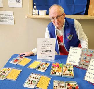 Mark Hanson, miembro del Consejo Immaculate Heart of Mary 9270 en Riverview, Nuevo Brunswick, y ávido pescador, muestra algunos de los broches y alfileres de solapa personalizados que fabrica con moscas de pesca para recaudar fondos para las donaciones benéficas del Consejo. Desde 2011, Hanson, que también vende moscas de pesca normales, ha recaudado más de $36,000 dólares canadienses, que el Consejo ha entregado a organizaciones locales como Harvest House Atlantic y Crossroads for Women.
