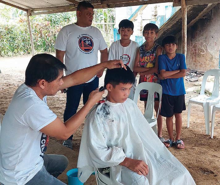 Antonio Basada, del Consejo Santa María 4526 en Samar Oriental, Visayas, corta el pelo a niños del barrio de Sohutan durante una Caravana Serbisyo Paghigugma (Servicio por Amor) patrocinada por el Consejo. Además de cortar el pelo gratuitamente, los Caballeros y sus familiares proporcionaron alimentos y kits de atención dental a casi 60 niños de la comunidad.