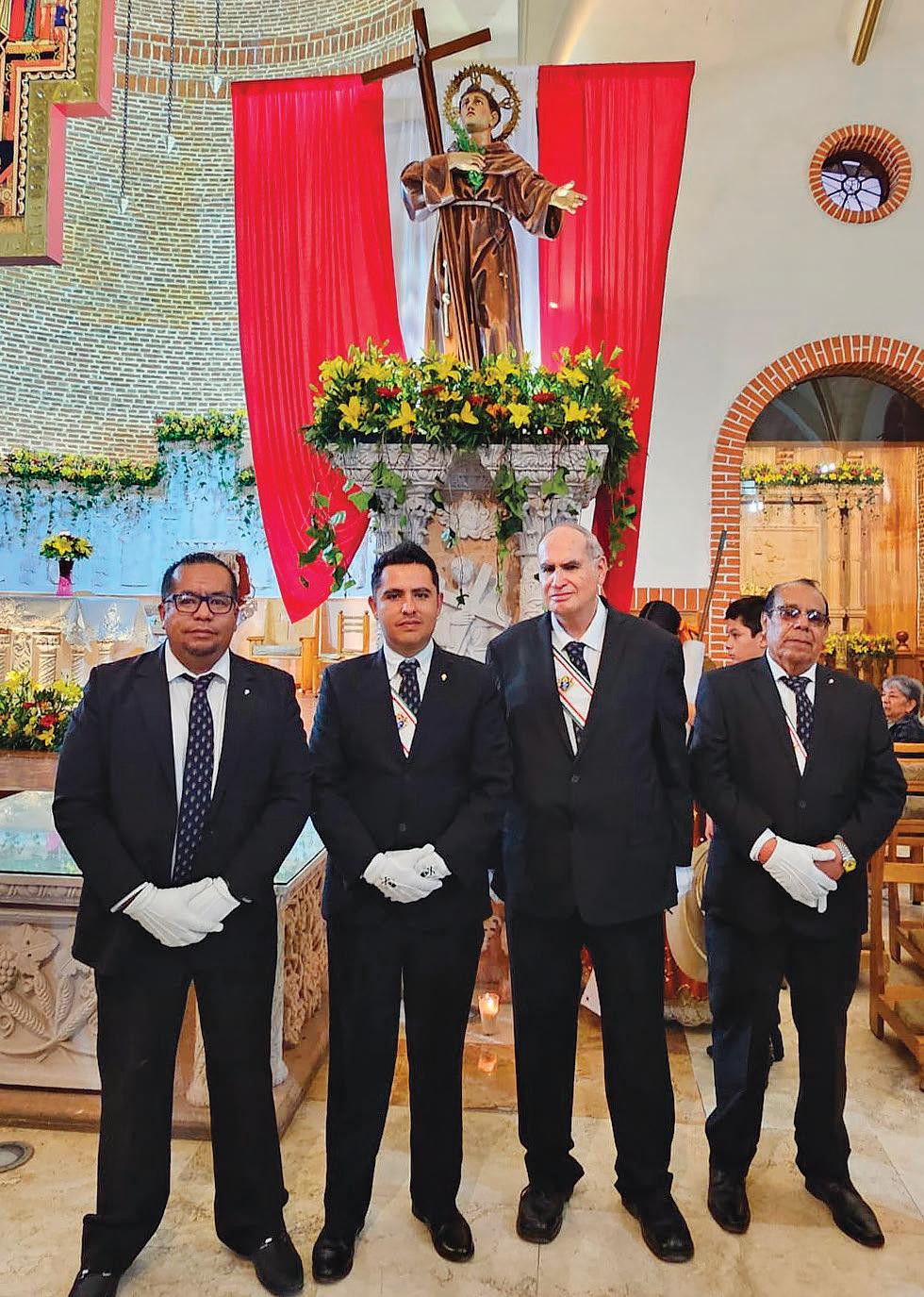 Izq.: Miembros de la Asamblea 422 Generalísimo Agustín de Iturbide en Aguascalientes, México, se reúnen junto a la estatua de San Felipe de Jesús después de la misa en la Parroquia de San Felipe de Jesús. Los Caballeros proporcionaron una guardia de honor para la misa del 5 de febrero, que honró al patrón de la parroquia, el primer santo mexicano, en su día de fiesta.