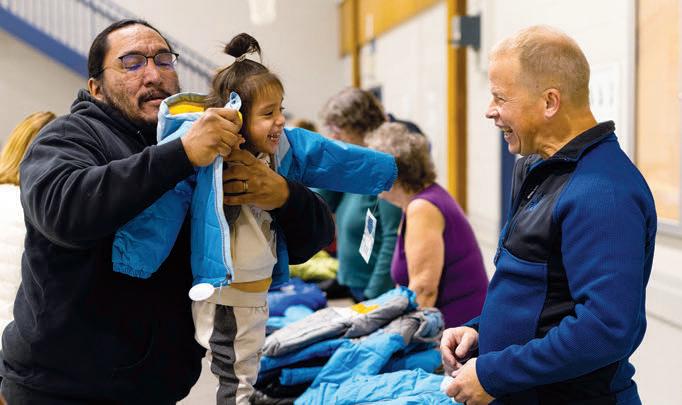 Shane Hanson (right), a member of Msgr. Robert A. Feehan Council 1604 in Bismarck, N.D., shares a smile with a young girl as her dad helps her try on a new winter jacket at a Knights of Columbus Coats for Kids distribution at St. Mary’s Elementary School. All six councils in District #7 contributed to the annual event, which this year provided nearly 180 children with coats, gloves and knit caps.
