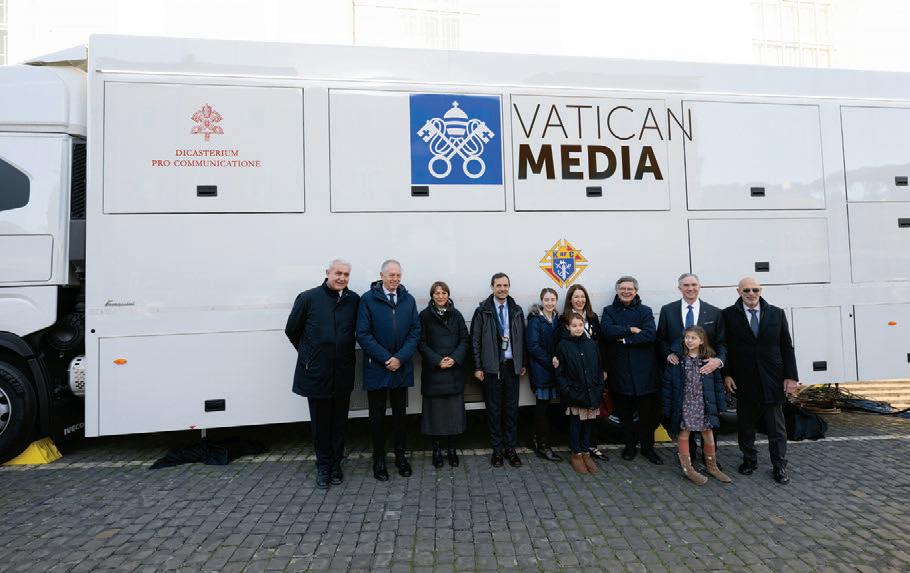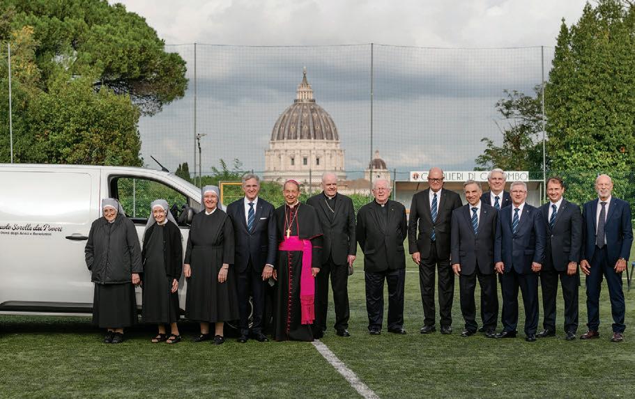 Miembros de la Junta Directiva de los Caballeros de Colón junto al Cardenal Edwin O’Brien, las Hermanitas de los Pobres e invitados después de la bendición de una nueva camioneta para las Hermanitas en el centro recreativo Campo Sportivo Pio XI de la Orden en Roma, Italia. La ceremonia de dedicación tuvo lugar durante una reunión de la junta y una peregrinación el otoño pasado. Las hermanas, socias de los Caballeros desde hace mucho tiempo, utilizarán el nuevo Fiat Scudo 2024 para transportar alimentos, muebles y otras donaciones, y viajar a sus otras comunidades en Italia.