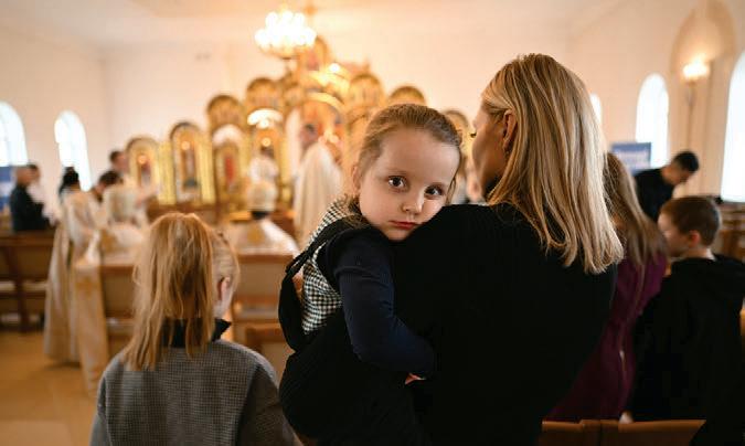 Una mujer sostiene a su hija durante una Divina Liturgia organizada por el Consejo Santo Mártir Josafat 18318 para las familias de soldados caídos en la capilla del Seminario Teológico de Ivano-Frankivsk el 30 de diciembre de 2023. Siguiendo el llamado del Beato Michael McGivney a servir a la viuda y al huérfano, los Caballeros han priorizado el cuidado de las familias que han perdido a esposos, padres y otros miembros de la familia debido a la guerra. Esto ha incluido la organización de cenas de Navidad y grupos de apoyo para viudas.