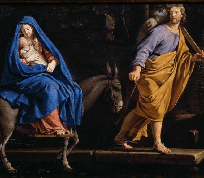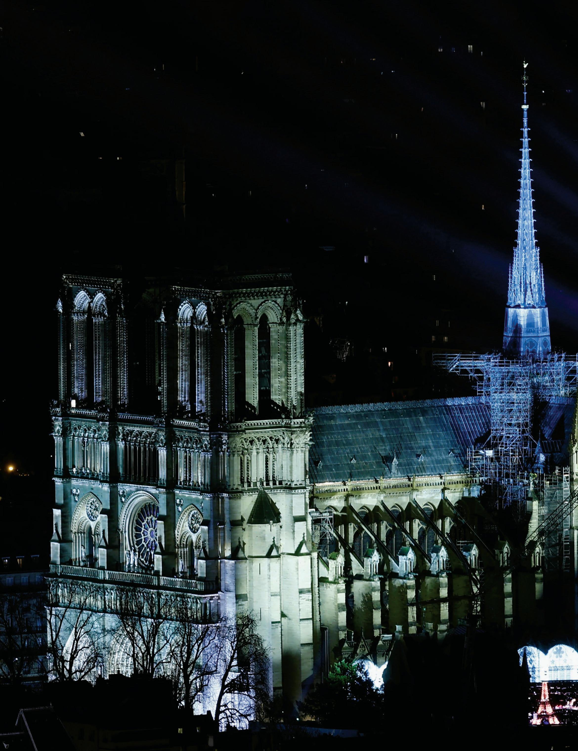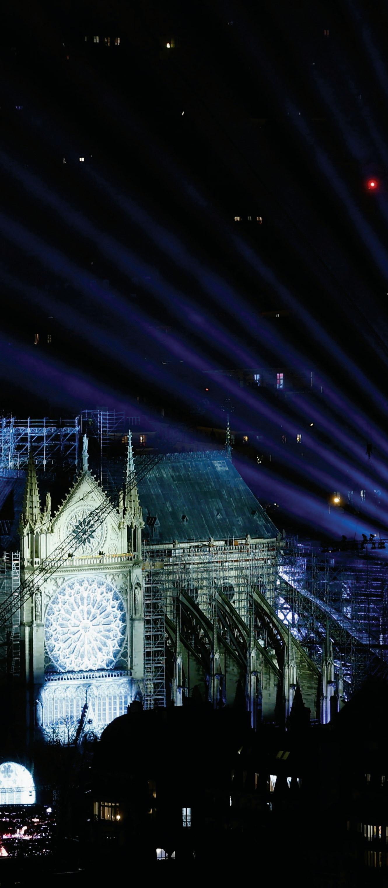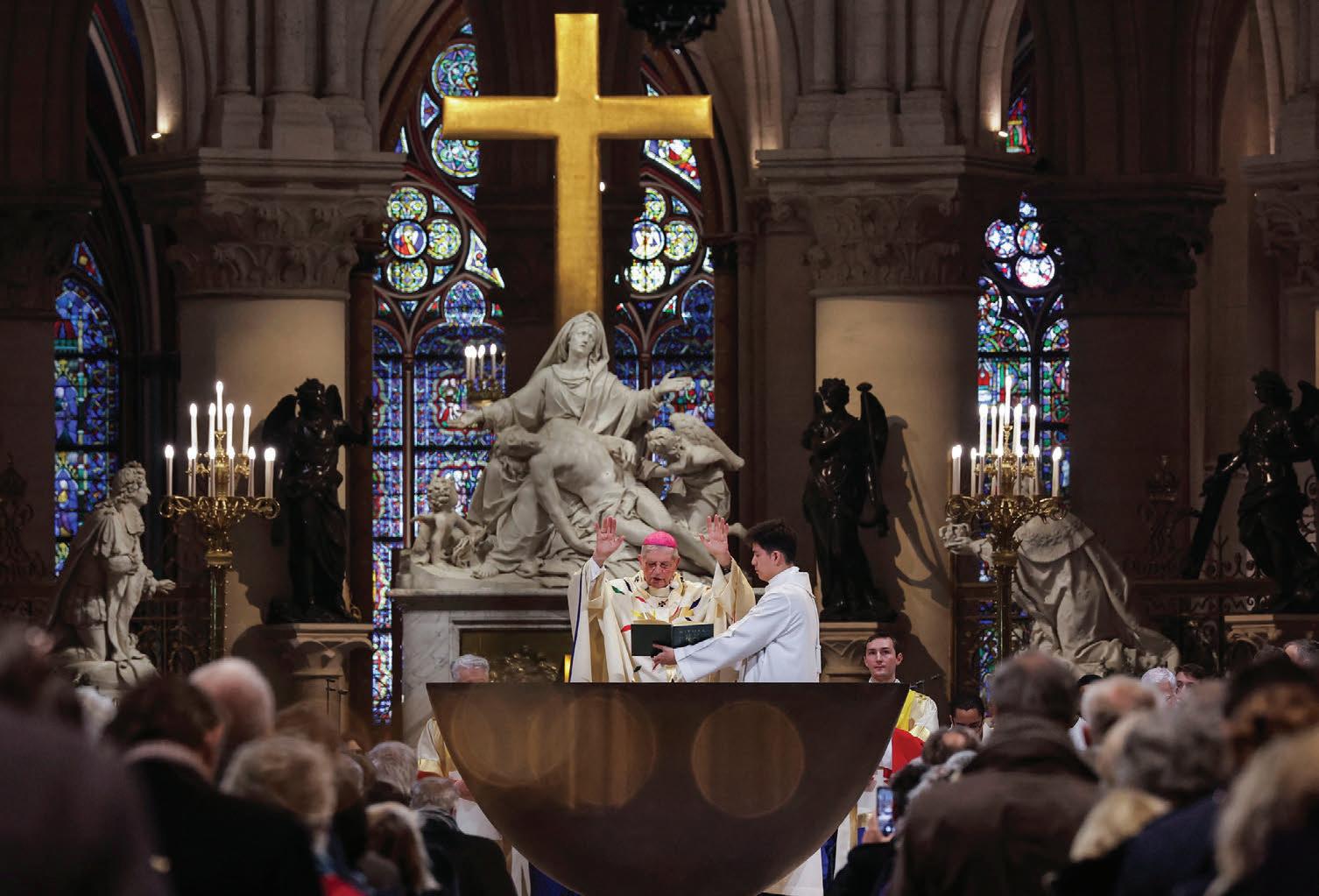 El rosetón oeste de la recién restaurada Catedral de Notre-Dame de París representa a la Santísima Virgen María sosteniendo al Niño Jesús, rodeada por las 12 tribus de Israel. Esta imagen fue tomada durante una misa en honor a los bomberos y restauradores el 15 de diciembre de 2024, cinco años después de que un incendio casi destruyera esta obra maestra gótica (ver página 10).