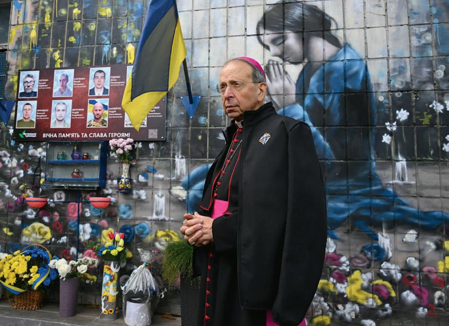 El Capellán Supremo, Arzobispo William Lori, se detiene en la Calle Yablunska en Bucha, Ucrania, durante su visita el 19 de octubre de 2024, para orar por ocho hombres ejecutados por las fuerzas rusas durante los primeros días de la guerra. El Arzobispo Lori, quien visitó Ucrania del 19 al 21 de octubre, también oró en un memorial a 119 víctimas de la masacre de Bucha de 2022, que tuvo lugar cerca de los terrenos de la Iglesia de San Andrés el Primer Llamado. Ese mismo día, visitó la cercana ciudad de Irpin, también entre las primeras en sufrir ataques intensos, y participó en una distribución de Abrigos para los Niños organizada por el Consejo Beato Nicolás Charnetski 16890.