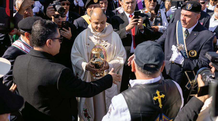 El Maestro Supremo Michael McCusker (derecha) saluda al Padre Jesús Alberto Tijerina Bernal (izquierda) de la Diócesis de Nuevo Laredo, México, antes de entregar una Rosa de Plata de los Caballeros de Colón durante la ceremonia anual de intercambio entre Caballeros de los Estados Unidos y México en el Puente Internacional Gateway to the Americas en Laredo, Texas. De pie en el centro, con vestimentas y sosteniendo también una Rosa de Plata, está el Padre Iden Bello, rector de la Catedral de San Agustín en Laredo.