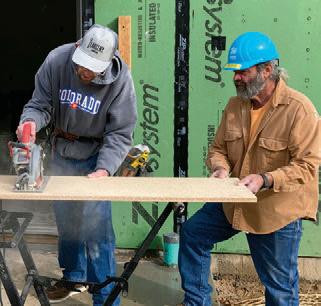 Los miembros del Consejo St. Mary Tri-Parish 11803 en Rifle, Colorado, cortan madera durante un día de trabajo con Habitat for Humanity Roaring Fork Valley, ayudando en la construcción de un nuevo complejo de casas adosadas y condominios. Esta fue la primera vez que el Consejo trabajó con Habitat for Humanity.