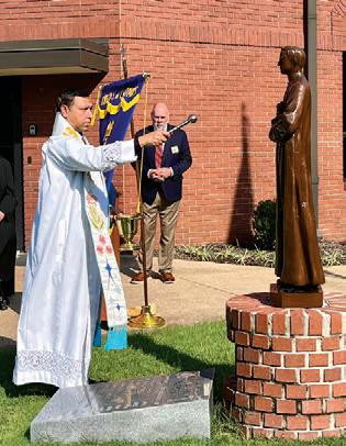 El Padre Jolly Sebastian, párroco de la Iglesia Católica Our Lady of Perpetual Help y Capellán del Consejo Germantown (Tennessee) 7449, bendice una nueva estatua del beato Michael McGivney mientras el Gran Caballero Steve Signaigo observa. La estatua reemplazó a una similar que fue destruida por una tormenta el año pasado.