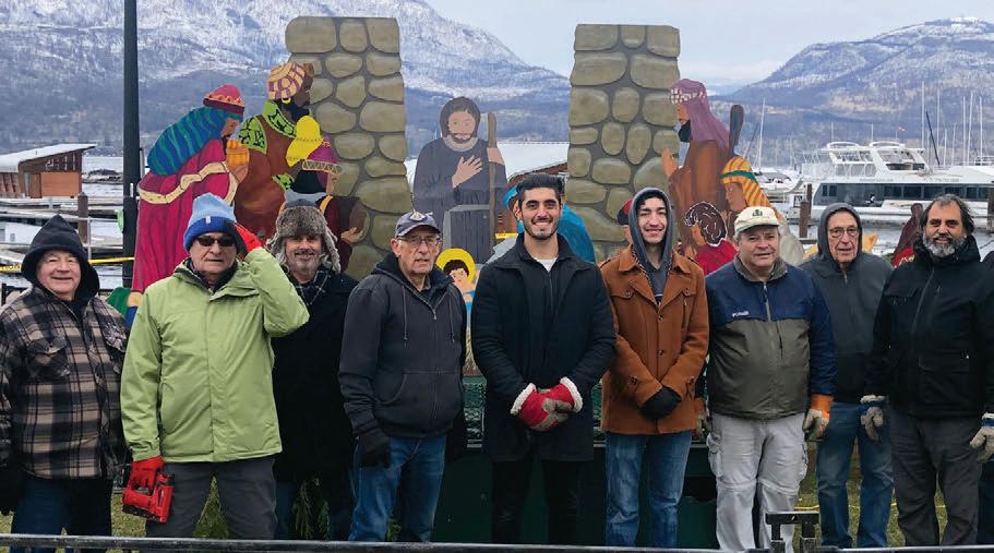Miembros de cinco Consejos cerca de Kelowna, Columbia Británica, se reúnen frente a una exhibición de Natividad que colocaron en el parque Kerry de la ciudad durante el Adviento de 2024. Los Caballeros asumieron la responsabilidad de la exhibición de la ciudad en diciembre de 2020, erigiéndola cada año desde entonces como parte de la campaña Mantener a Cristo en la Navidad de los Consejos.