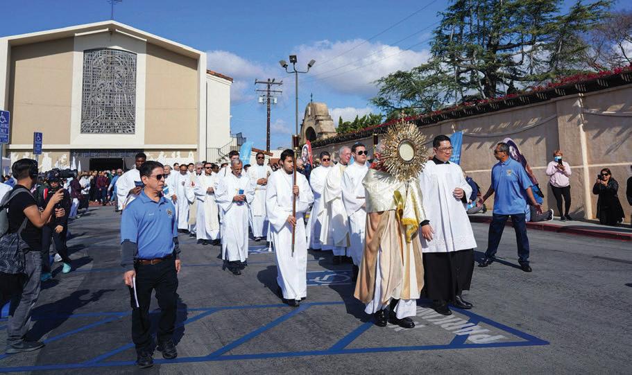 Caballeros del Consejo Mission San Gabriel (Cal.) 3517 actúan como mariscales durante una procesión eucarística encabezada por el Arzobispo José Gómez de Los Ángeles. Esta procesión de seis millas, que inició en la Capilla de la Anunciación de la Misión de San Gabriel el 25 de marzo, fue organizada por el Año del Reavivamiento Diocesano del Reavivamiento Eucarístico Nacional.