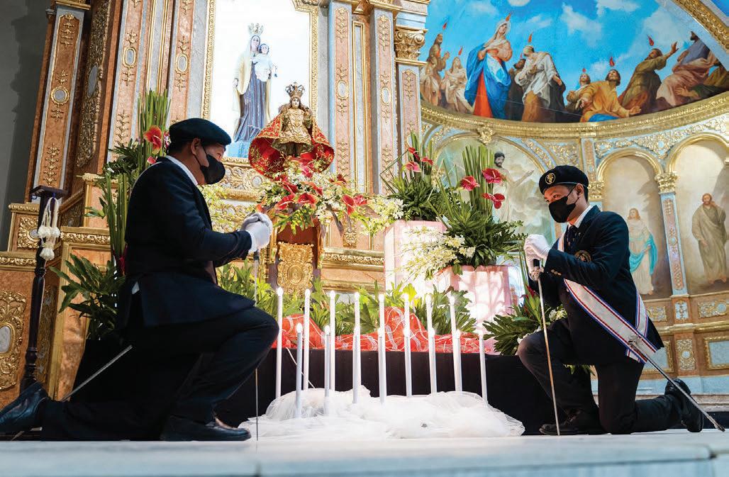 Caballeros de la Asamblea Nuestra Madre María, Mediadora de Todas las Gracias 3342, en la ciudad de Parañaque, Luzón Norte, hacen guardia de honor ante el Santo Niño de Tondo durante la visita de la preciada estatua a la Parroquia de la Resurrección de Nuestro Señor. Esta imagen de Cristo como niño rey se llevó a Filipinas en el siglo XVI.