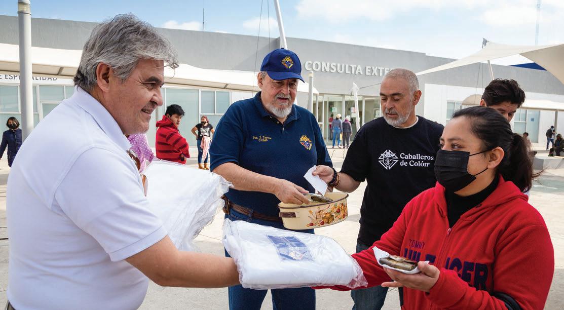El Guardián Joaquín Rodríguez García (izq.) y otros miembros del Consejo 11849 Octaviano Márquez y Toriz de Puebla, México Sur, reparten mantas y tamales a personas que se encuentran fuera del Hospital General del Sur. El Consejo realiza con regularidad repartos similares para atender a personas sin hogar o de escasos recursos.