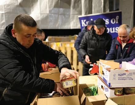 Miembros del Consejo 17533 San Francisco de Asís de Gowino y del Consejo 15708 Padre Edmund Roszczynialski de Wejherowo rezan la Coronilla de la Divina Misericordia antes de preparar paquetes de ayuda para los ucranianos necesitados. El grupo, en el que también había voluntarios de otras organizaciones, reunió 2400 cajas de alimentos para transportarlas a Ucrania en un convoy caritativo de Caballeros de Colón.