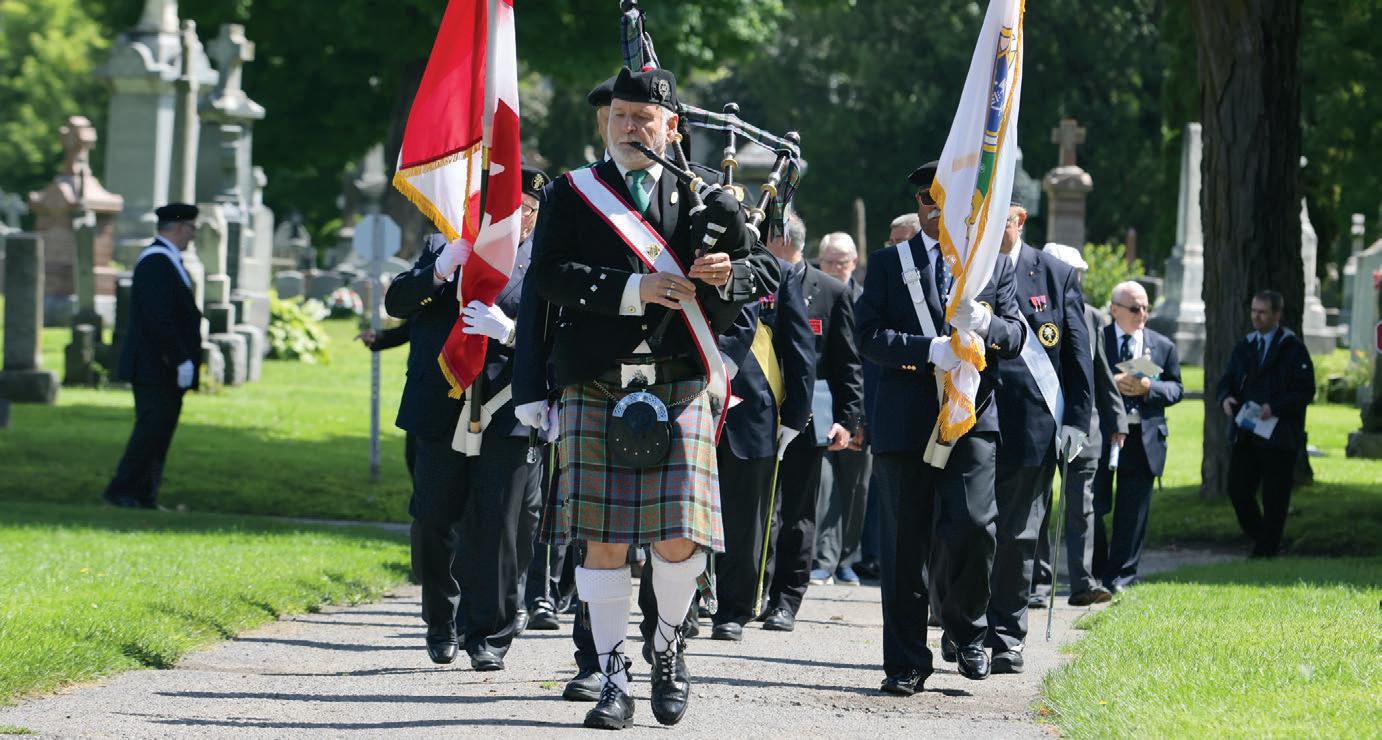 Ci-dessus : Le joueur de cornemuse Donald MacDonald, ancien grand Chevalier du Conseil 485 St. Patrick Basilica, dirige une garde d’honneur du Quatrième Degré dans le cimetière Notre-Dame à Ottawa, en Ontario, le 12 août. • En regard : Le Député d’État de l’Ontario Bruce Poulin rafraîchit le lettrage décoloré sur la pierre tombale du père John O’Gorman, membre fondateur du premier conseil de l’Ontario.
