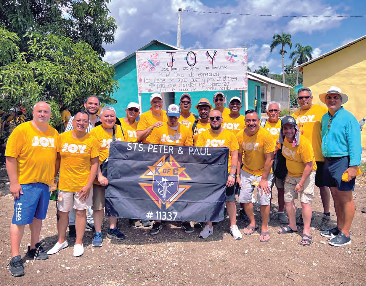 Caballeros del Consejo Santos Pedro y Pablo 11337 en Mississauga, Ontario, muestran el estandarte de su Consejo antes de la inauguración de un nuevo parque en Sosúa, República Dominicana, que los Caballeros y otros voluntarios de la Parroquia de los Santos Pedro y Pablo ayudaron a construir durante un viaje misionero en julio. Quince Caballeros participaron en el viaje, durante el cual el grupo reparó equipos de juego, pintó casas y realizó otros proyectos de construcción.