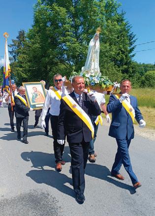 Knights from Our Lady, Queen of the World Council 15650 in Węgrzyn, Poland, carry a statue of Our Lady of Fatima and the Order’s pilgrim icon of St. Joseph through the streets during their parish’s annual Corpus Christi procession. The council hosted the St. Joseph icon for one week during its journey through Poland.