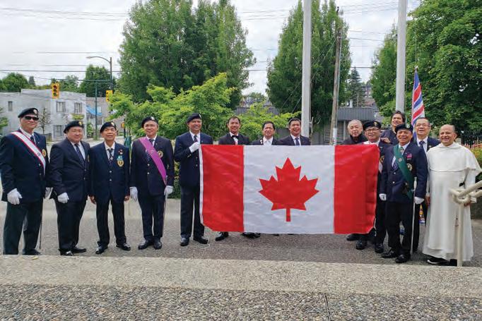 Members of St. Pedro Calungsod Assembly 3400 and St. Mary’s Council 13072 in Vancouver, British Columbia, display the Canadian flag before raising it at St. Mary’s Parish to mark Canada Day on July 1. Dominican Father Joseph D’Souza (right), pastor and Council 13072’s chaplain, offered a prayer during the event.