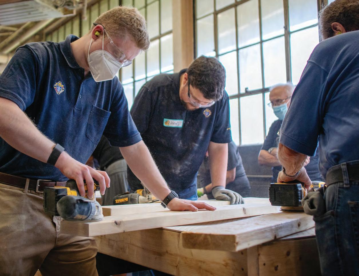 Grand Knight Drew Tarnowski (center) of Archbishop Denis O’Connor Council 14969 in Windsor, Ontario, and other Knights prepare wood to make a child’s bed during a build with Sleep in Heavenly Peace in Windsor. More than 75 Knights from several local councils helped construct 200 headboards and footboards for 100 beds. Sleep in Heavenly Peace will distribute the beds to families in need throughout Canada.
