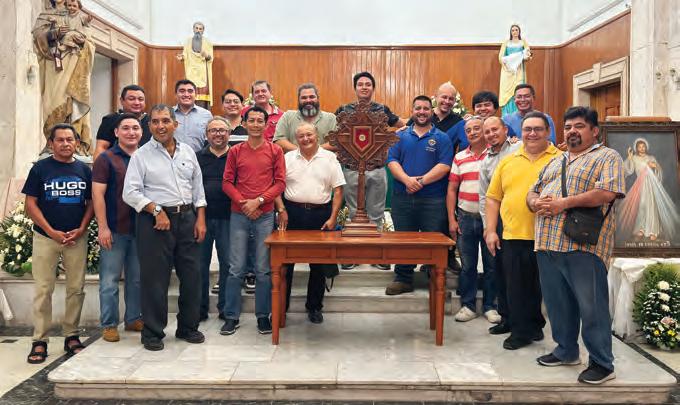 Members of Benedicto XVI Council 18211 in Mérida, Mexico South, gather around a reliquary containing a first-class relic of Blessed Michael McGivney. The council commissioned a local master carpenter to craft the wooden reliquary, which features the Order’s emblem on one side. The relic will be displayed at Santa Ana Parish and travel to surrounding parishes with K of C councils for veneration.