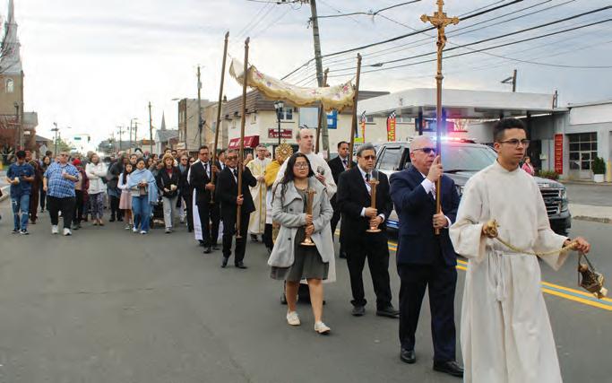 Members of Queen of Peace Council 3428 in North Arlington, N.J., lead parishioners from Queen of Peace Church in a Eucharistic procession after the church’s annual Mass for the Unborn. The procession to Holy Cross Cemetery concluded with a prayer in front of the cemetery’s memorial to the unborn and Benediction. Afterward, Council 3428 presented three local pregnancy centers with donations of $2,000 each, proceeds from the council’s annual baby bottle drive. Each center will also receive $400 from the Supreme Council through the ASAP (Aid and Support After Pregnancy) program.