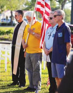 Father Frank D’Amato (left) and members of Mother of Perpetual Help Council 5629 in Vero Beach, Fla., pray the rosary at the conclusion of a campaign to raise awareness of the mental health challenges faced by veterans. Working with 22aday.org, four councils and three assemblies from Florida District #62 set up a display of white crosses around Mother of Perpetual Help Catholic Church, adding 22 crosses daily over 30 days to represent the U.S. military veterans who die by suicide every day.