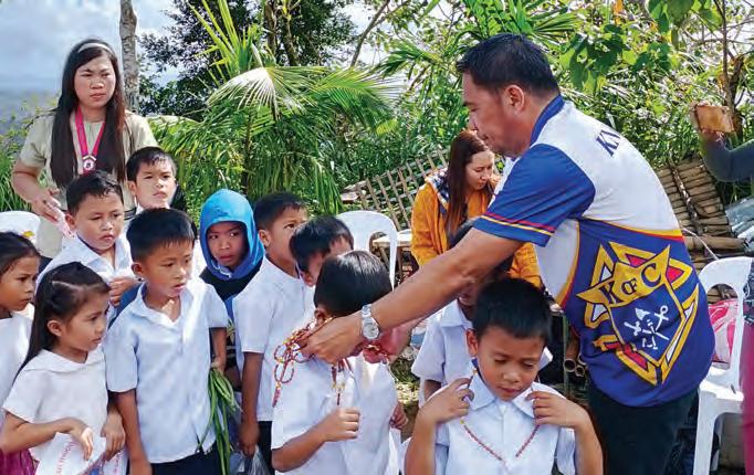 District Deputy Miguel Larete gives rosaries to students from Supanga Elementary School during a distribution hosted by Our Lady of Immaculate Conception Council 5889 in Calinog, Visayas. The council worked with military personnel from the Philippine Army 12th Infantry Battalion to hand out water bottles, lunch containers, toys and more to 300 students in need.