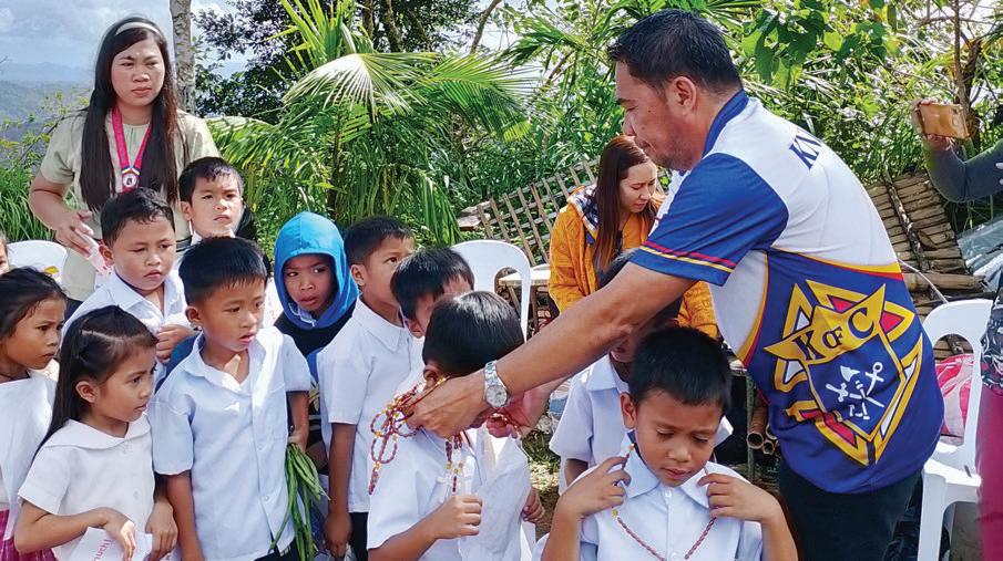 Le DĂ©putĂ© de District Miguel Larete donne des chapelets aux Ă©tudiants de lâĂ©cole primaire Supanga lors dâune distribution organisĂ©e par le Conseil 5889 Our Lady of Immaculate Conception Ă Calinog, Visayas. Le conseil a travaillĂ© avec le personnel militaire du 12e bataillon dâinfanterie de lâarmĂ©e des Philippines pour remettre des bouteilles dâeau, des contenants Ă lunch, des jouets, et plus encore, Ă 300 Ă©lĂšves dans le besoin.