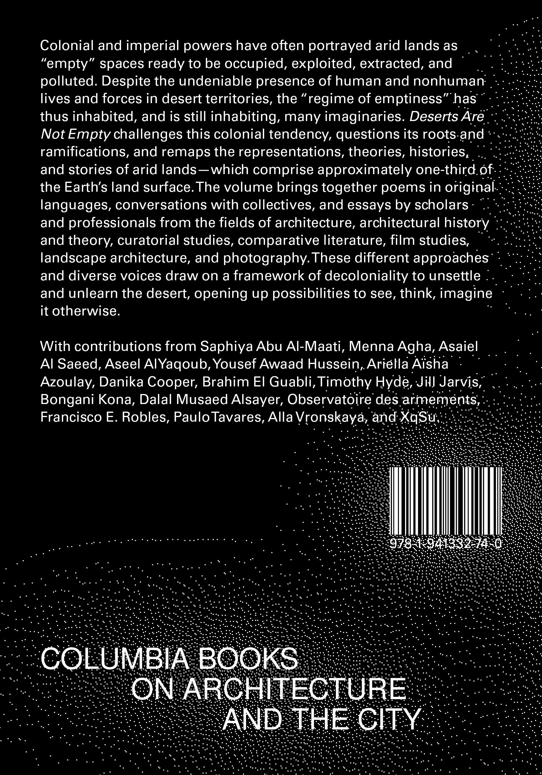 The volume echoes—among other reverberations—that architecture is not only what is designed and built but also what is indebted, destroyed, dismantled, contaminated, displaced, buried, unearthed, and wasted. Deserts Are Not Empty insists: “This is no longer an innocent game.”
