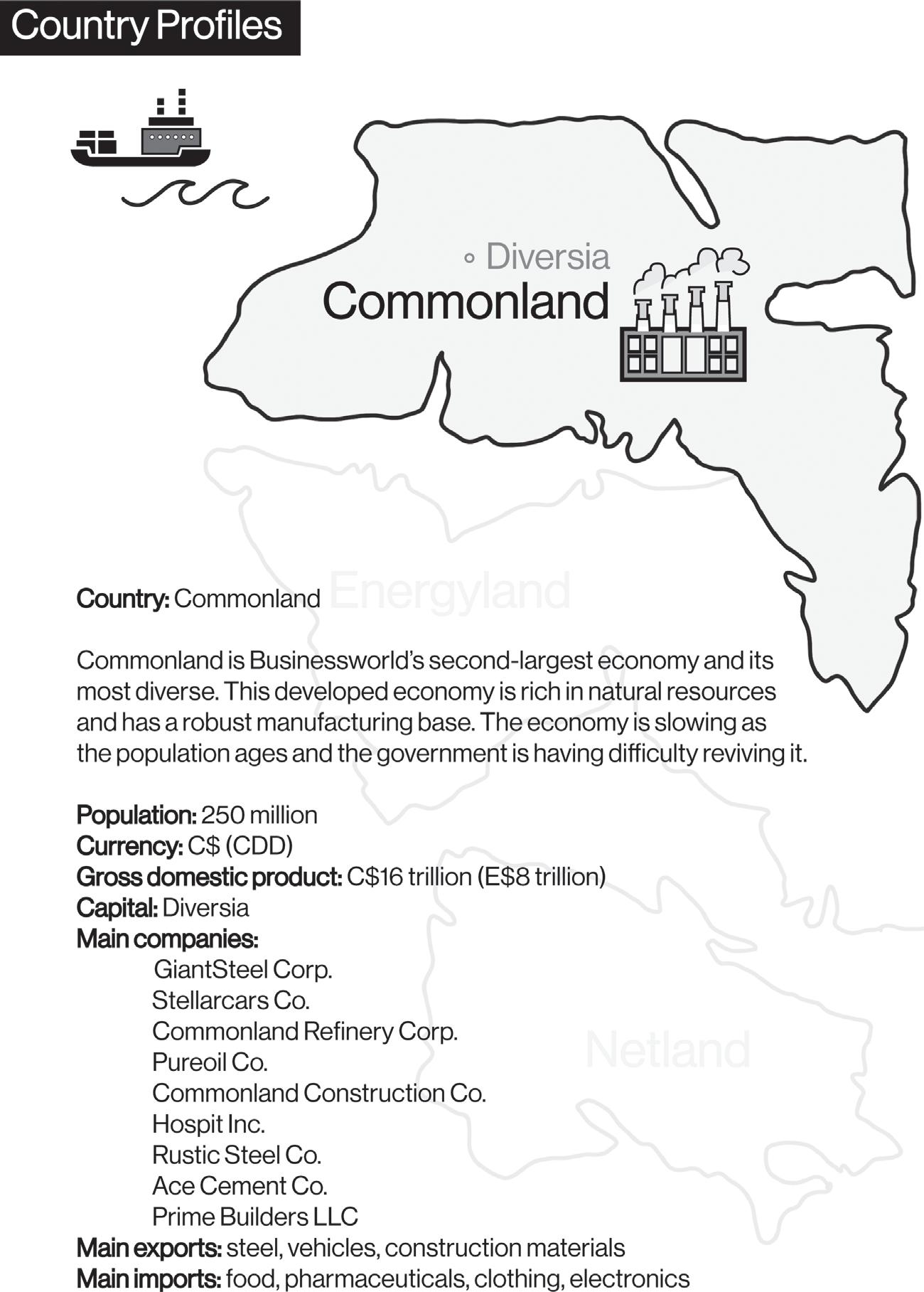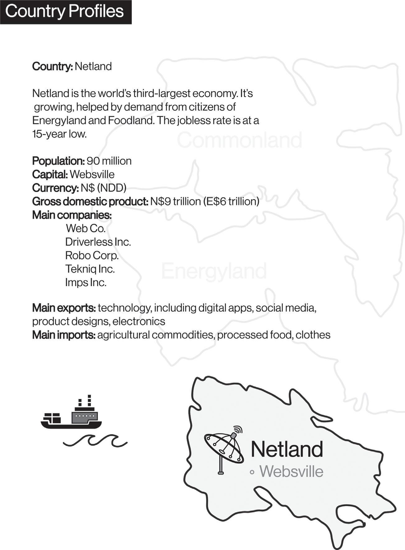 You’ll get to know the economics of Businessworld through the stories you’ll read in each chapter and the exercises you’ll complete. Think of the countries as tools to help you understand and report on money and power in today’s complex world. By design, there will be many similarities to news events past and present.