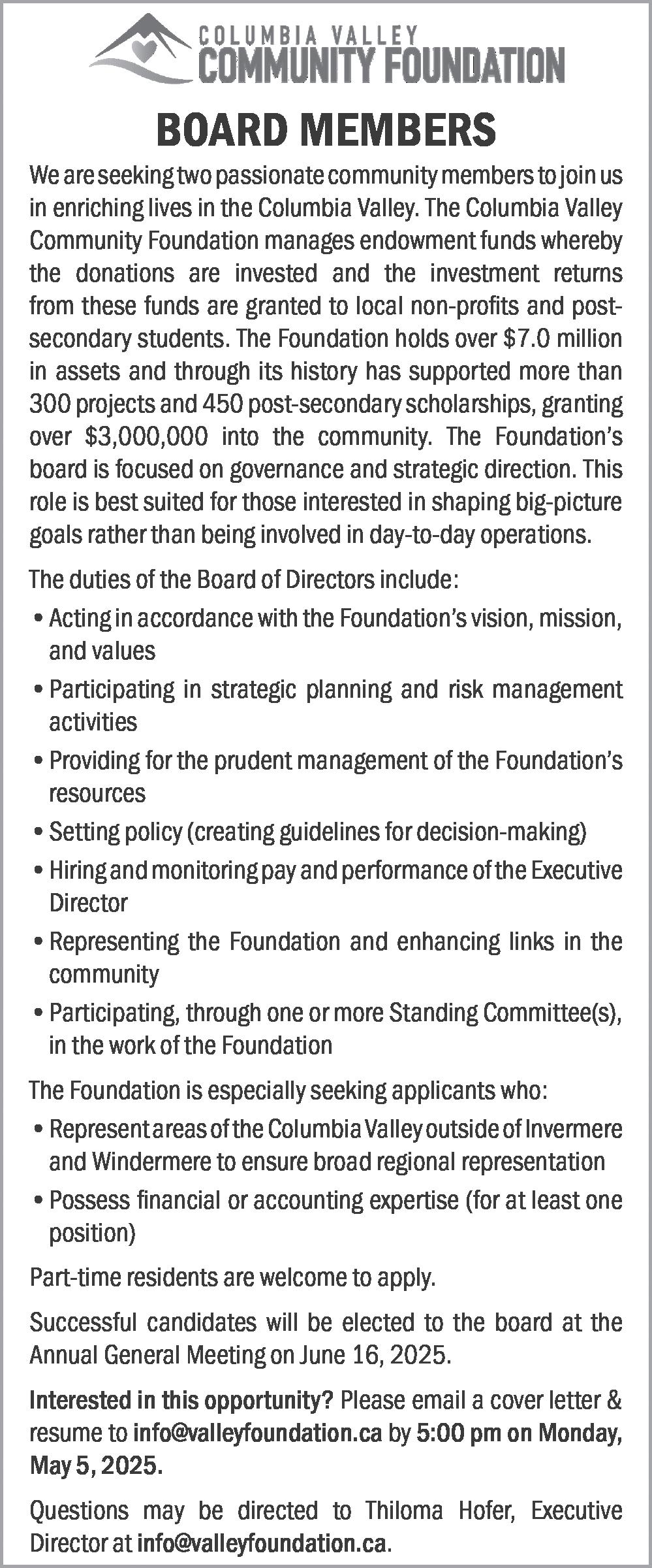 For more information please contact 250-341-5683 or email: invermere crn@gmail com