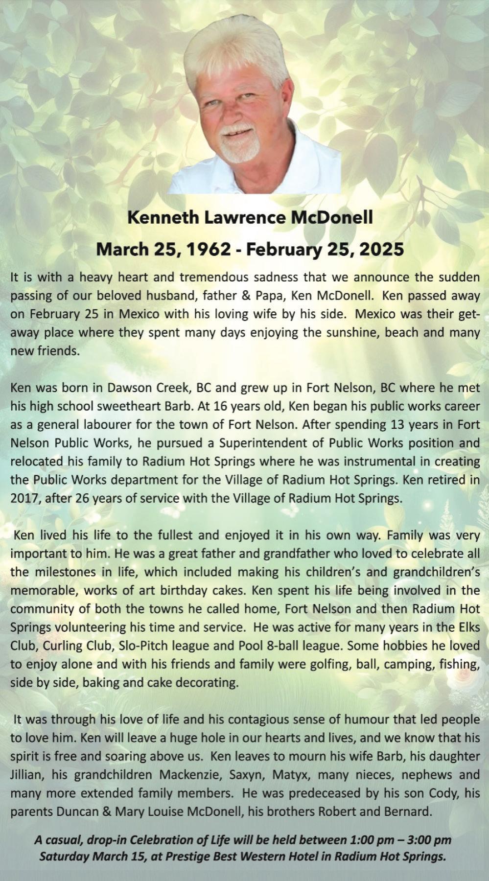 important unit so babies and their parents do not have to travel outside our area for treatment and help. Her name and donation amount will be displayed in the hospital, which will be a beautiful remembrance of her giving ways. There will be a funeral for Diane at her church, St. Anthony Mission in Canal Flats, on March 22, 2025 at 2:00pm with a reception at the Canal Flats Civic Centre thereafter until 5:00pm. For those who wish to donate on her behalf, we thank you kindly in advance; below are the ways to donate.