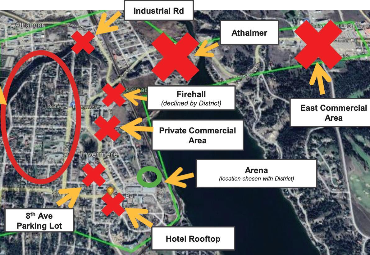 The other locations included a spot between the Windermere Valley Childcare Society daycare and Invermere firehall; at Mount Nelson Athletic Park (MNAP); on the roof of the downtown Invermere Inn; at the site of the old community hall on 8th Avenue (which is now a gravel parking lot); on privately owned land near the provincial government services buildings on 4th Street; a spot in the industrial park; a place in Athalmer near the Lake Windermere Resort lands; and a location near the crossroads.