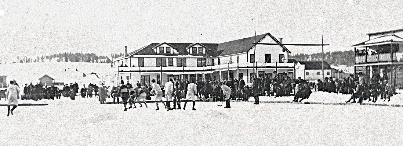 Playing hockey was a pastime in the winter months when a challenge could lead to a game wherever ice could be found. This photograph, dated back to 1913, shows a hockey game in progress in front of the Invermere Inn. Mother Nature had left a sheet of ice on the road thick enough that they could skate and play hockey.