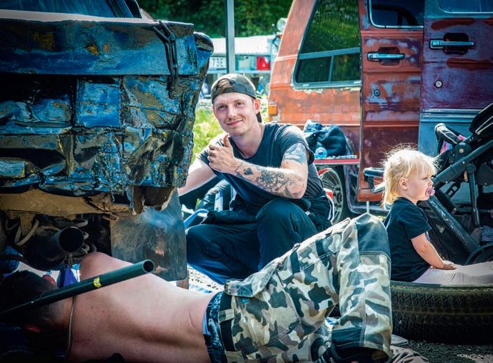Jens Claeson och Sebastian Claeson tillhör en annan av de stora folkracefamiljerna från Hästveda. De håller som bäst på att dunka ut plåten på Sebastians Audi som har fått sig några rejäla smällar under tävlingen.