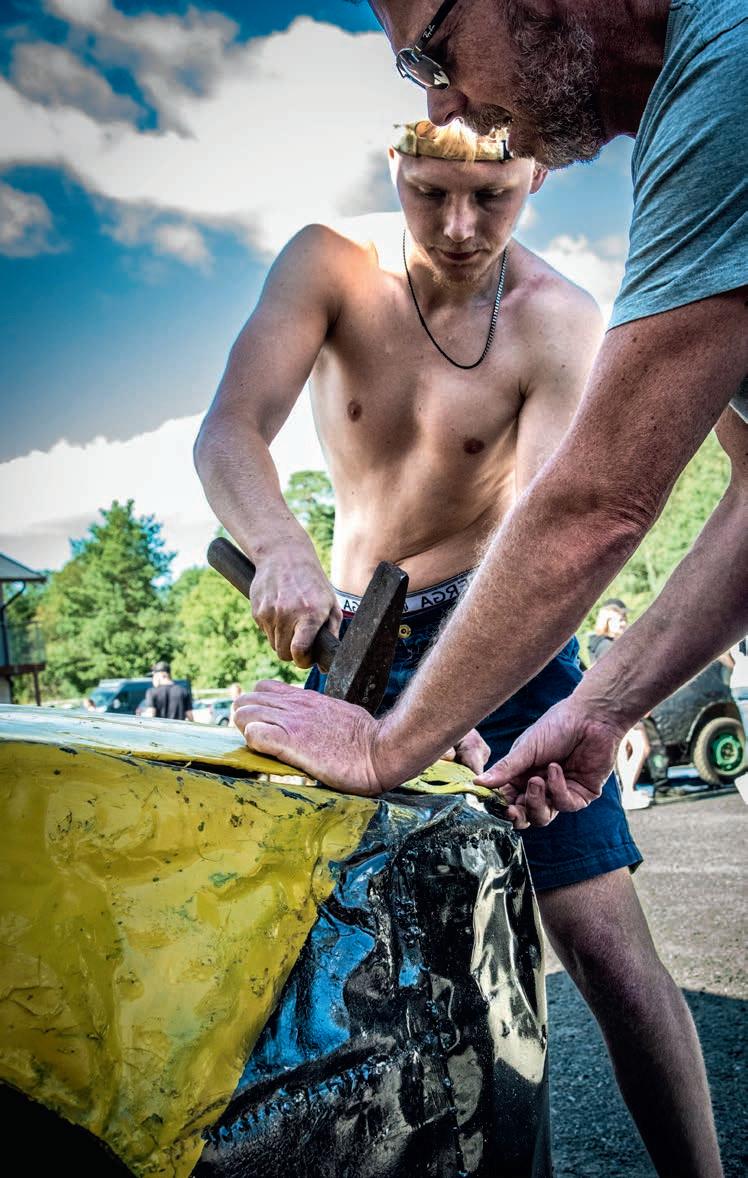 Jens och Sebastian Claesson från Hästveda dunkar plåt mellan varven. Släggan är ett välanvänt verktyg när bilarna ska göras startklara efter ett ruffigt heat.
