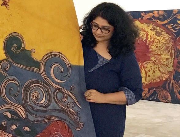 – Först ut är Lavanya Mani, som kommer från Bangalore och gör sin första utställning någonsin i Sverige. Hon jobbar skulpturalt med textil, och har i sina verk här låtit sig inspireras av inspireras av bibliska berättelser och indiska myter och fabler där hon kopplar ihop deras naturkatastrofer med dagens klimatfrågor, säger Milena Høgsberg konstnärlig ledare på Wanås Konst.