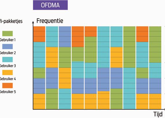 Het grote voordeel van OFDMA, dat ook gebruikt wordt in LTE-netwerken, is dat er data naar verschillende apparaten tegelijkertijd verstuurd kunnen worden (afbeelding 3). Deze afzonderlijke ‘kanalen’ worden resource units genoemd. Bij OFDM worden steeds alle data naar één apparaat tegelijkertijd gestuurd. Uiteraard moeten clients wel ondersteuning bieden voor OFDMA om hier gebruik van te kunnen maken. Wifi 6 kan ook gebruikmaken van OFDM, het is volledig achterwaarts compatibel.