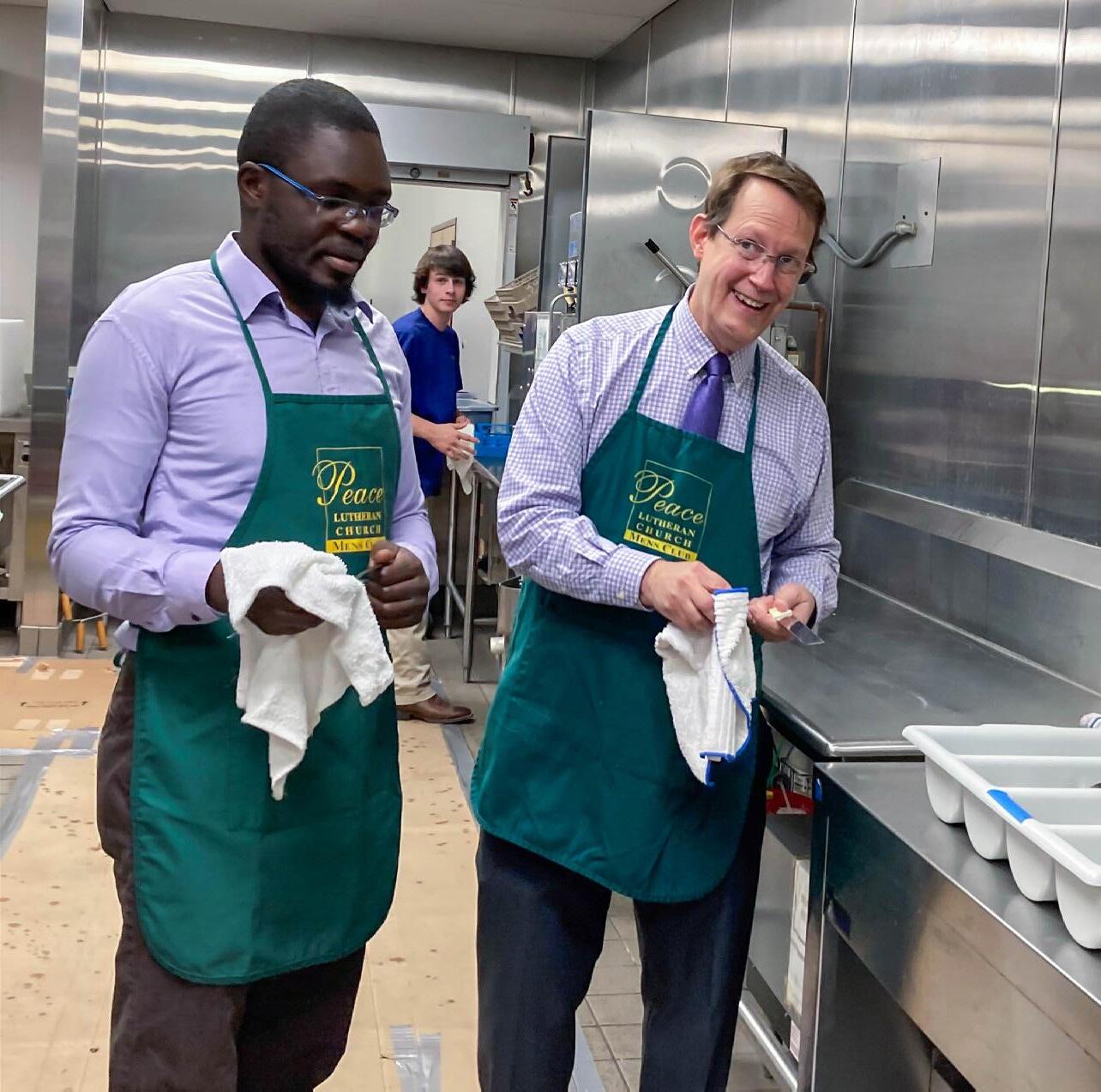 “[RFE congregations] provide our students with a place where they can grow and be exposed to what life in the church is all about.”Master of Arts student David Osachi and Residential Alternate Route student David Evans serve at a sausage dinner at Peace Lutheran Church in St. Louis.