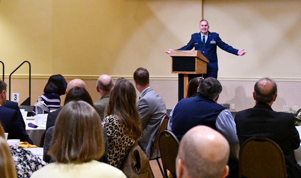 About 300 people attended the annual Lutheran Prayer Breakfast Nov. 2, 2022, at the LiUNA Event Center in St. Louis. The annual event, sponsored by several St. Louis-based Lutheran ministries, is an opportunity for attendees to reaffirm faith, celebrate fellowship and join together in prayer and proclamation of God’s grace through Christ. Speaking at this year’s breakfast was Rev. Travis Ferguson (M.Div. ’17), associate pastor of Christ Lutheran Church Ministries in La Mesa, Calif. He spoke on “Quo Vadis? The Uncomfortable Call of Christ In an Age of Comfortability.” Ferguson has served as a chaplain in the U.S. Air Force since 2014. Rev. Travis Ferguson serves as the speaker during the breakfast Nov. 2, 2022.
