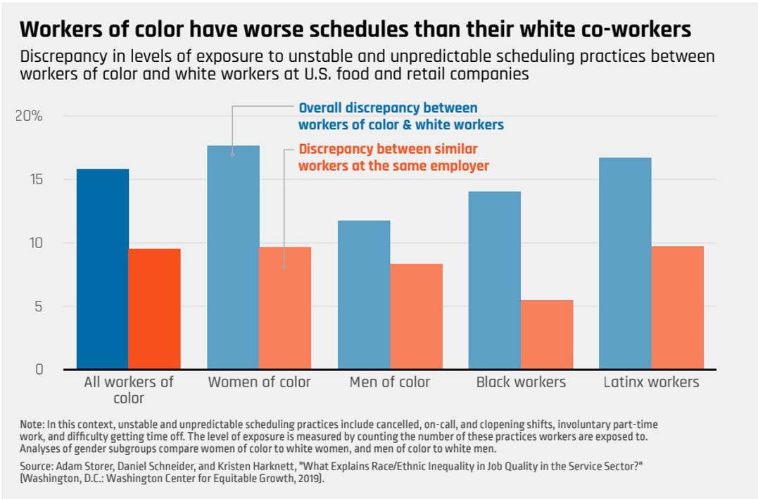 A 2019 research study found that there was a 14% discrepancy in the assignment of shift work between Black and White workers; the study also showed that about 63% of it can be attributed to the differing race of the shift manager and the shift worker (Schneider and Harknett, 2019).