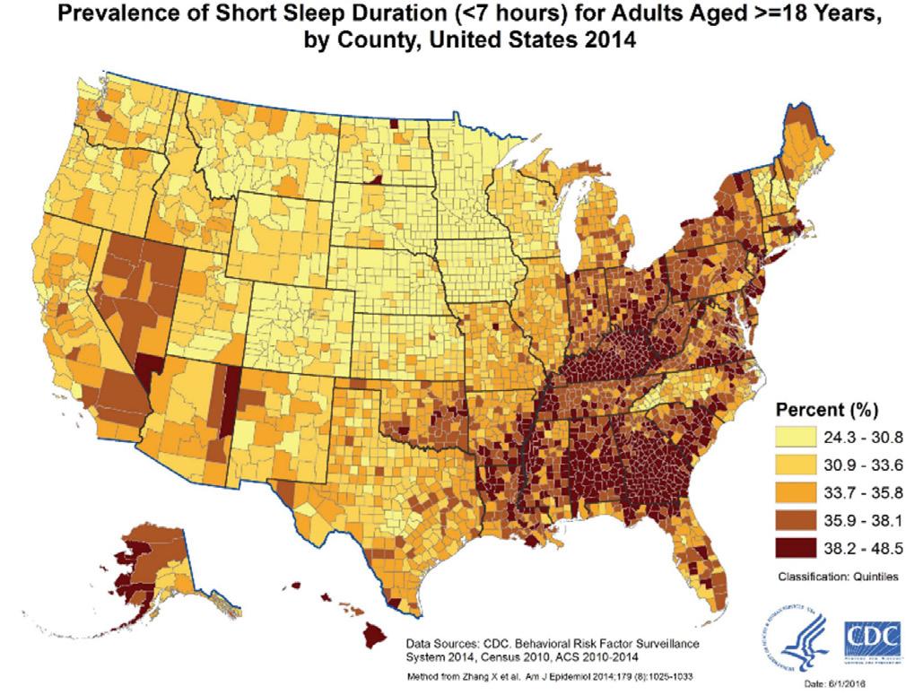 In 2014, the Centers for Disease Control and Prevention (CDC) released a comprehensive sleep report detailing the sleeping habits of Americans across the nation by age, race, and gender. The CDC recommends for adults at least 7 hours of sleep with no more than one interruption a night and taking 30 minutes or less to fall asleep. The report found that 35% of Americans do not meet these requirements. An analysis of a sleep map and racial demographic map reveals a correlative relationship between sleep quality and race (Frey, 2019).