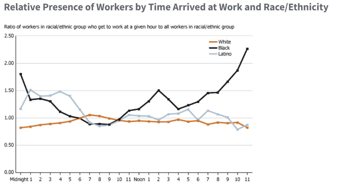 Mandate regulations on shift work and increase the minimum wage. As research shows, shift workers are susceptible to the unconscious or conscious bias of their shift managers. Federal and/or state regulations around shift work should be implemented to control for discrimination. A blind assignment of schedules is recommended to ensure equity in the shift-labor market. Increasing the minimum wage will provide relief to Black workers and provide opportunities to work fewer jobs across the day and night.